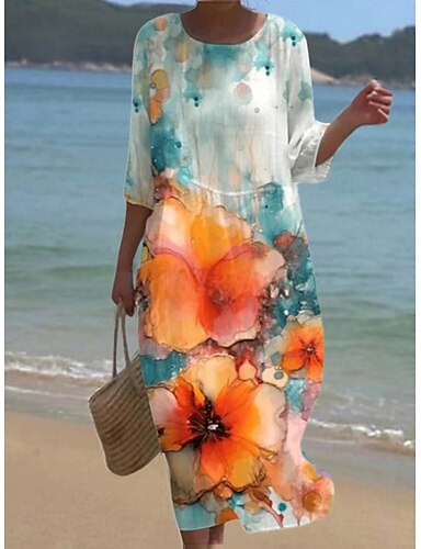 女性用 ミディドレス カジュアルドレス プリントドレス ファッション 近代の 日常 ビーチ 週末 レギュラー フラワー 七分袖 クルーネック ホワイト イエロー ネービーブルー カーキ色 春 秋
