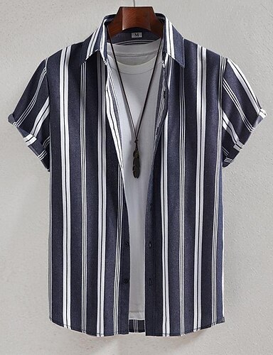 男性用 シャツ サマーシャツ カジュアルシャツ ビーチシャツ ボタンアップシャツ ストライプシャツ ネイビーブルー 半袖 縞柄 折襟 バケーション ハワイアン 衣類 ポリエステル ファッション カジュアル 快適