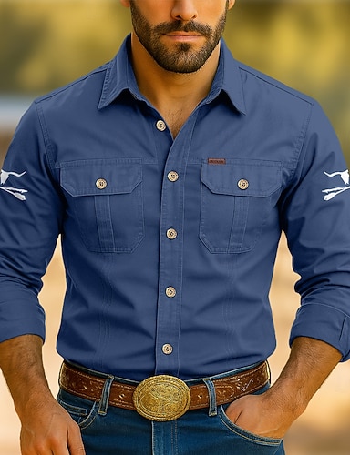 男性用 ワークシャツ ウエスタンシャツ カーゴシャツ ブラック アーミーグリーン ダークブルー 長袖 カウプリント 折襟 スポーツ・アウトドア カジュアル 衣類 カジュアル ミリタリー