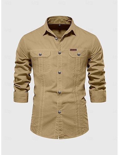 男性用 シャツ ワークウェアシャツ カジュアルシャツ ワークシャツ ボタンアップシャツ カーゴシャツ ブラック カーキ色 アーミーグリーン ベージュ グレー 長袖 平織り ラペル バケーション ハワイアン フロントポケット 衣類 コットン100% ファッション カジュアル 快適