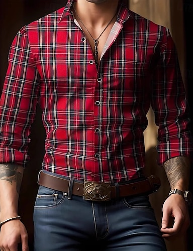 男性用 シャツ サマーシャツ カジュアルシャツ ビーチシャツ ボタンアップシャツ ブラック ルビーレッド ブルー グリーン 長袖 チェック ラペル バケーション ハワイアン ボタン 衣類 ポリエステル ファッション カジュアル 快適