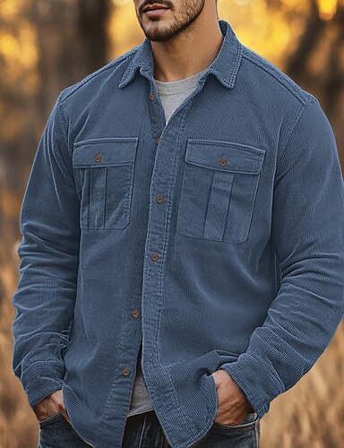 男性用 カジュアルシャツ コーデュロイシャツ ボタンアップシャツ ブラック ルビーレッド ネイビーブルー ブルー グリーン 長袖 純色 ラペル バケーション ストリート ポケット 衣類 あたたか ファッション ストリートファッション 屋外
