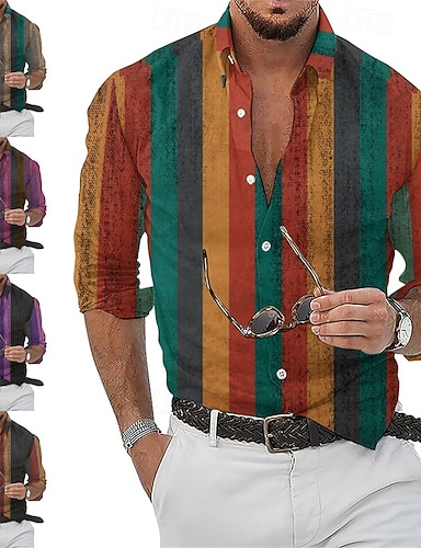 男性用 シャツ サマーシャツ カジュアルシャツ ビーチシャツ ボタンアップシャツ ライトグリーン ピンク ルビーレッド パープル グリーン 長袖 縞柄 ラペル バケーション ハワイアン 衣類 ポリエステル ファッション カジュアル 快適