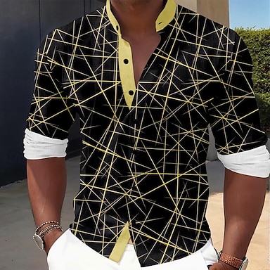 男性用 幾何学模様 ライン 抽象芸術 シャツ ボタンアップシャツ スタンドカラーシャツ 長袖 カジュアル アウトドア バケーション 日常 春 秋 スタンドカラー Band Collar 3Dプリント リネンライクシャツ ブラック
