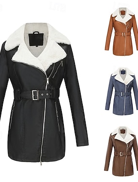 女性用 レザージャケット シェルパジャケット 保温 快適 ジッパー ポケット ベルト付き カジュアル 純色 バケーション ストリート カジュアル デイリーウェア レギュラー 折襟 レギュラー 長袖 アウターウェア ブラック ブルー キャメル 秋 冬