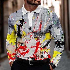 男性用 スプラッシュインク ワッフルポロシャツ ゴルフシャツ 長袖 ポロシャツ 襟付きシャツ カジュアル ストリート 日常着 アスレイジャー ボタン 3Dプリント 春 秋 冬 グレー
