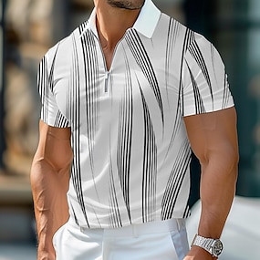 男性用 幾何学的な ライン ワッフルポロシャツ 半袖 ポロシャツ 襟付きシャツ ビジネスカジュアル アスレイジャー アウトドアウェア デイリーウェア ボタン 3Dプリント 夏 ホワイト