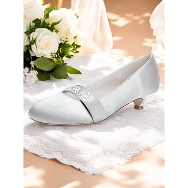 女性用シルバーラウンドトゥキトンヒール - カクテルパーティーやフォーマルな夜にぴったりのクリスタル装飾のサテンローヒールドレスシューズ