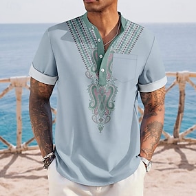 男性用 ボヘミアン ペイズリー ダマスク シャツ ヘンリーシャツ スタンドカラーシャツ 半袖 エスニック バケーション 日常 夏 春 スタンドカラー Band Collar ボタン フロントポケット1つ リネンライクシャツ ブルー カーキ色