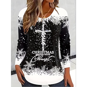 クリスマス 女性用 Tシャツ グラフィック スノーフレーク柄 クリスマス ヴィンテージ ファッション スタイリッシュ 長袖 クルーネック ラウンドネック レギュラートップス 日常 週末 プリント ブラック ゴールド 夏 春 秋 冬