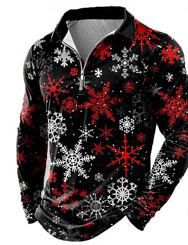クリスマス 男性用 スノーフレーク柄 ポロシャツ ジップポロ 長袖 ポロシャツ カラー カジュアル 日常着 祝日 祭り ジッパー 春 秋冬 ブラック
