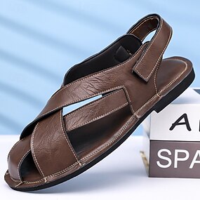調節可能な留め具が付いたメンズブラウンフェイクレザークロスストラップサンダル - 暖かい季節にぴったりの快適でトレンディなサンダル