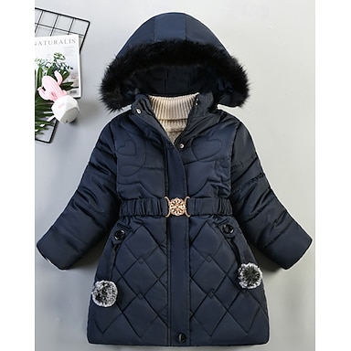 子供 女の子 ダウン 純色 ファッション ファートリム ジッパー ポケット 学校 コート アウターウェア 4〜12年 冬 ピンク ワイン ネイビーブルー
