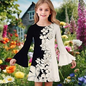 女子 3D フラワー ドレス 長袖 夏 春 バケーション 日常 祝日 プリンセス 美しい 甘い 子供 4〜12年 カジュアルドレス A ラインドレス 膝丈 レギュラー