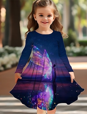 女子 3D グラフィック バタフライ ドレス 長袖 夏 春 バケーション 日常 祝日 プリンセス 美しい 甘い 子供 4〜12年 カジュアルドレス A ラインドレス 膝丈 レギュラー