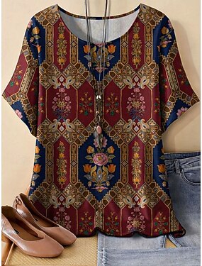 女性用 リネン風シャツ Tシャツ 夏のトップス グラフィック 幾何学模様 ヴィンテージ ファッション カジュアル 半袖 ラウンドネック レギュラートップス 日常 週末 パッチワーク プリント ルビーレッド 夏 春