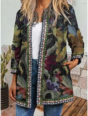 女性用 カジュアルジャケット 快適 高通気性 ポケット オープンフロント エレガント カジュアル ボヘミアンヴィンテージ フラワー カジュアル デイリーウェア オープンフロント ロング クルーネック レギュラー 長袖 アウターウェア ピンク ブルー 春 秋