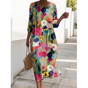 ウィメンズ マキシドレス カフタン 3/4丈袖 クルーネック カジュアル シフトドレス Aラインドレス ボヘミアン デイリーホリデーデート フローラル グラフィック ピンク レッド ブルー フクシア 春