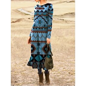 女性用 マキシドレス シースドレス T シャツドレス 旅行度假风 カジュアル ボヘミアン 祝日 デート レギュラー フラワー グラフィック 幾何学模様 長袖 クルーネック ダークブルー 春 秋 冬