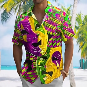 マルディグラ 男性用 幾何学模様 マスク カーニバル シャツ ボタンアップシャツ 半袖 ファッションカジュアル バケーション 贈り物 祝日 夏 春 折襟 襟付きシャツ フロントポケット1つ グリーン