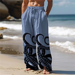 男性用 ハワイアン 蛸 パンツ 3Dプリント ストレートレッグパンツ ミディアムウエスト 巾着ゴムウエスト アウトドア ストリート 祝日 夏 春 秋 リラックスフィット マイクロエラスティック