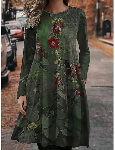 女性用 ミディドレス カジュアルドレス T シャツドレス A ラインドレス 旅行度假风 カジュアル デート レギュラー フラワー グラフィック 長袖 クルーネック グリーン 春 秋 冬