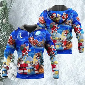 クリスマス メンズ サンタクロース 3D パーカー グラフィック サンタクロース ファッション 3D プリント スポーツ アウトドア ホリデー パーカー ロイヤルブルー ブルー 長袖 フード付き プリント フロントポケット 春&秋のデザイナーシャツ