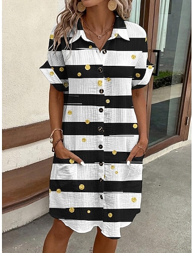 女性用 ミニドレス シャツドレス カジュアルドレス プリントドレス ファッション 近代の 日常 ビーチ 週末 レギュラー ストライプ 半袖 シャツカラー ホワイト 夏 春 秋