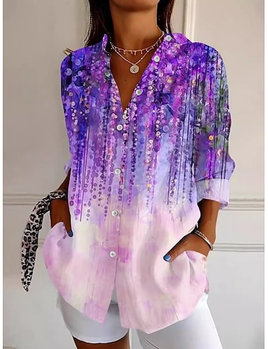女性用 シャツ フラワー 活発的 日常 スタイリッシュ 長袖 シャツカラー レギュラートップス 日常 祝日 ボタン プリント パープル 春 秋