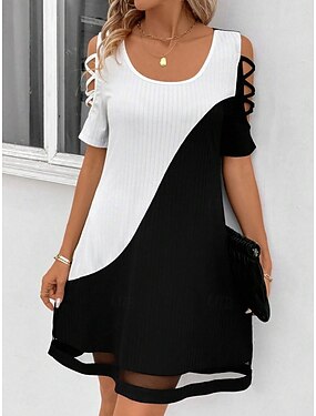 女性用 ミニドレス 黒いドレス カジュアルドレス 二次会ドレス / カクテルドレス フォーマルドレス スタイリッシュ ベーシック カジュアル バケーション 日常 レギュラー カラーブロック 半袖 クルーネック ホワイト ピンク ルビーレッド 夏 春