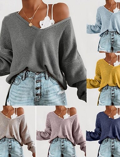 女性用 ニット プルオーバー エレガント ファッション ストリートファッション 純色 Vネック ニット 長袖 レギュラートップス ニット アウトドア 日常 祝日 ワインレッド イエロー 秋 冬