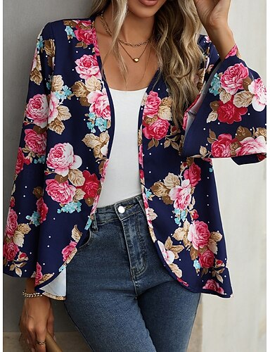 女性用 カジュアルジャケット 快適 高通気性 プリント カジュアル フラワー バケーション ストリート カジュアル デイリーウェア オープンフロント ショート ノーカラー レギュラー 長袖 アウターウェア 海軍 夏 春