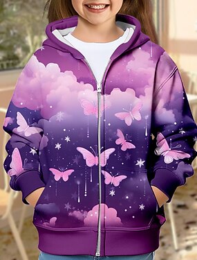女の子 3D バタフライ パーカー コート アウター 長袖 3Dプリント 秋 冬 活発的 ファッション かわいいスタイル 子供 3〜12年 アウトドア カジュアル 日常 レギュラー