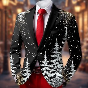 クリスマス 男性用 木 ブレザージャケット コート 快適 高通気性 アーティスティック カジュアル パーティーイブニングウェア 日常 祭り 3Dプリント ボタン 秋冬 ノッチドラペル 長袖 ブラック ホワイト