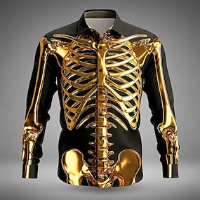 Halloween 男性用 ゴールド スケルトン ハロウィーンコスチューム シャツ ボタンアップシャツ 長袖 ダークパンクゴシック アウトドア 祝日 夏 春 折襟 3Dプリント 襟付きシャツ ゴールド