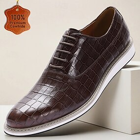 メンズブラウンクロコダイル柄ドレスシューズ - 本革レースアップオックスフォード、結婚式、宴会、イブニングパーティーに最適な高級フォーマルビジネスシューズ