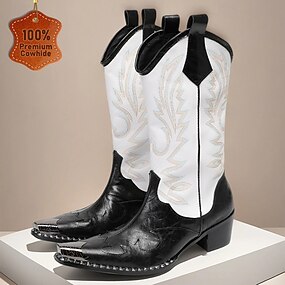 メンズの黒と白のウエスタンカウボーイブーツ - 刺繍入りのロングロデオブーツ。牧場スタイル、カントリーイベント、ラインダンスに最適です。