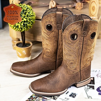 メンズブラウンウエスタンカウボーイブーツ - クラシックなレザーに細かい刺繍が施されており、カウボーイファッション、アウトドアイベント、カントリーミュージックフェスティバルに最適です。