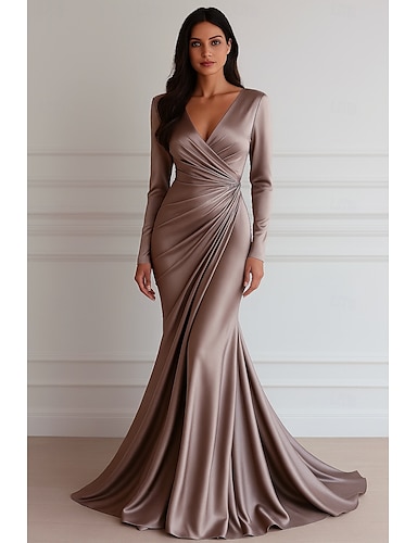 マーメイド/トランペットイブニングガウン エレガントドレス フォーマルウェディング フロアレングス ロングスリーブ Vネックドレス ストレッチサテン プリーツ付き