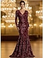 バーガンディのスパンコールのマーメイド/トランペットのイブニングドレス、エレガントなフォーマルドレス、フォーマルウェディング、フロアレングス、長袖、Vネック、ベルベット、2025