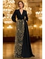 ブラックタイ ブラックxゴールド Aライン イブニングガウン スパークル ジャカード スカート ベルト付き フォーマル 結婚式 フロアレングス ロングスリーブ Vネック サテン スリット付き ポケットあり