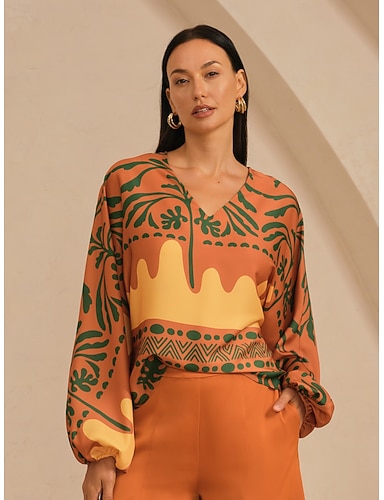 レディーストップス、鮮やかなフクシアプリント、サテンランタン、長袖、Vネック、海辺、バケーション、カジュアル、デイリー、春、夏、秋