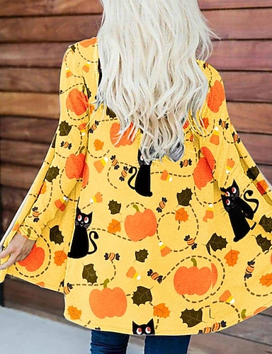 ハロウィン レディース カジュアルジャケット パンプキン 暖かい 快適 不規則 ヘム オープン フロント エレガント ヴィンテージ モダン スカル ストリート カジュアル デイリー ロング コラーレス 長袖 アウター ライトイエロー
