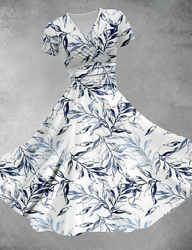 女性用 ミディドレス カジュアルドレス サマードレス ファッション 近代の 日常 ビーチ 週末 レギュラー リーフ柄 半袖 Vネック ブルー 春 秋