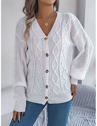 女性用 ニット カーディガン エレガント ファッション カジュアル 純色 リブ Vネック ボタン ニット 長袖 レギュラートップス ニット アウトドア 日常 祝日 ブラック ホワイト 秋 冬