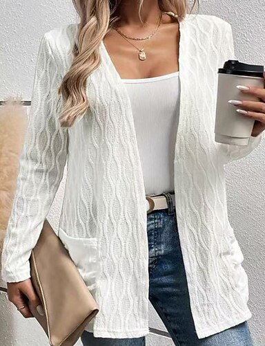 女性用 ニット カーディガン ストリートファッション カジュアル 純色 オープンフロント ポケット ニット 長袖 レギュラートップス ニット 日常 お出かけ 週末 ブラック ホワイト 秋 冬