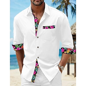 男性用 シャツ リネンシャツ サマーシャツ ビーチウェア ボタンアップシャツ フラワー バケーション キュリーズ ブラック ホワイト ピンク ブルー 長袖 ラペル 春 & 秋 衣類 スプライス