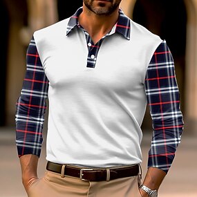 男性用 チェック ポロシャツ ゴルフシャツ 長袖 ポロシャツ 襟付きシャツ ビジネスカジュアル 作業服 フォーマルウェア フェスティバルウェア 3Dプリント ボタン 秋冬 ブラック ホワイト ダークネイビー
