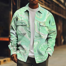 男性用 マーブル 抽象的な液体アート コーデュロイシャツ シャケット シャツジャケット 長袖 カジュアル アウトドア 日常着 秋 冬 折襟 ボタンダウン あたたか フラップポケット付きジャケット ピンク グリーン