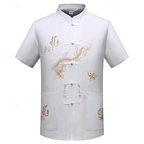 男性用 シャツ サマーシャツ カジュアルシャツ ビーチシャツ ボタンアップシャツ ライトイエロー ホワイト ルビーレッド ネイビーブルー グレー 半袖 ドラゴン カラー バケーション ハワイアン 刺しゅう 衣類 ポリエステル ファッション カジュアル 快適